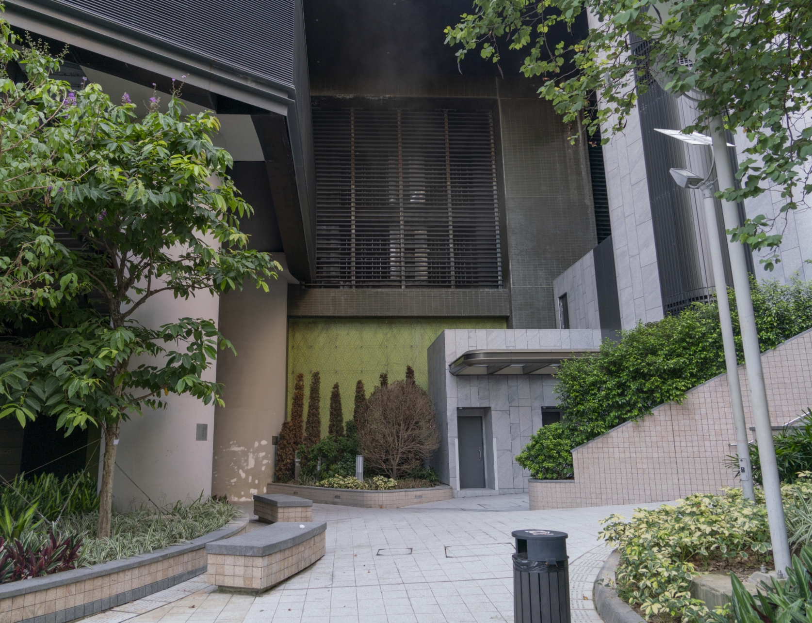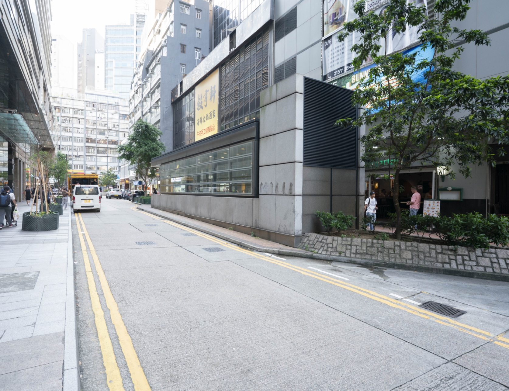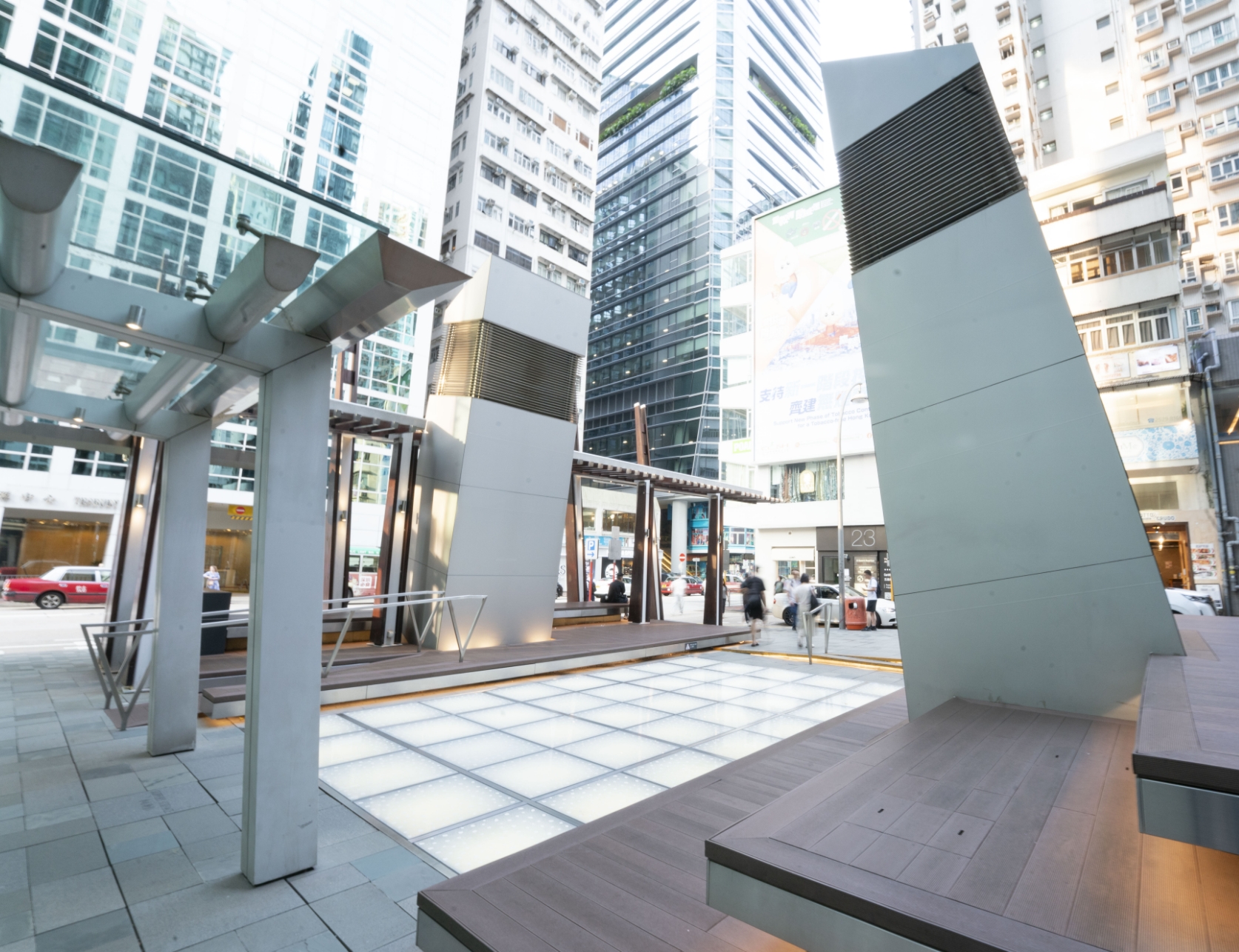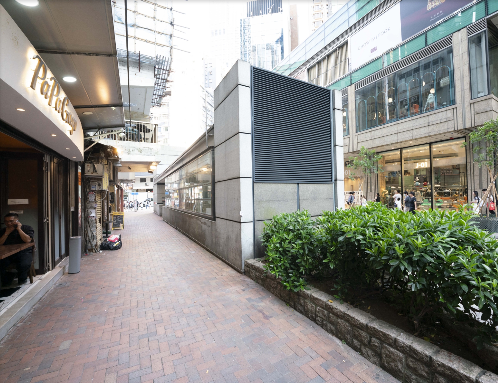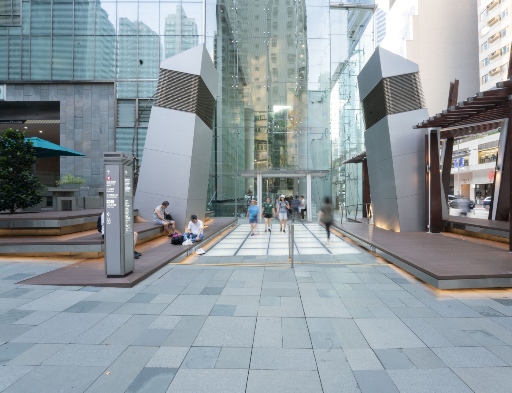 太古廣場三期的車站出口設有通風設施,其設計與路面的避雨亭及戶外園景和諧融合。